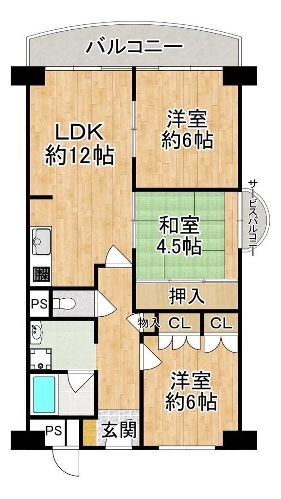 【65.35m2】と広いタイプでサービスバルコニーが付いている角部屋になります♪
